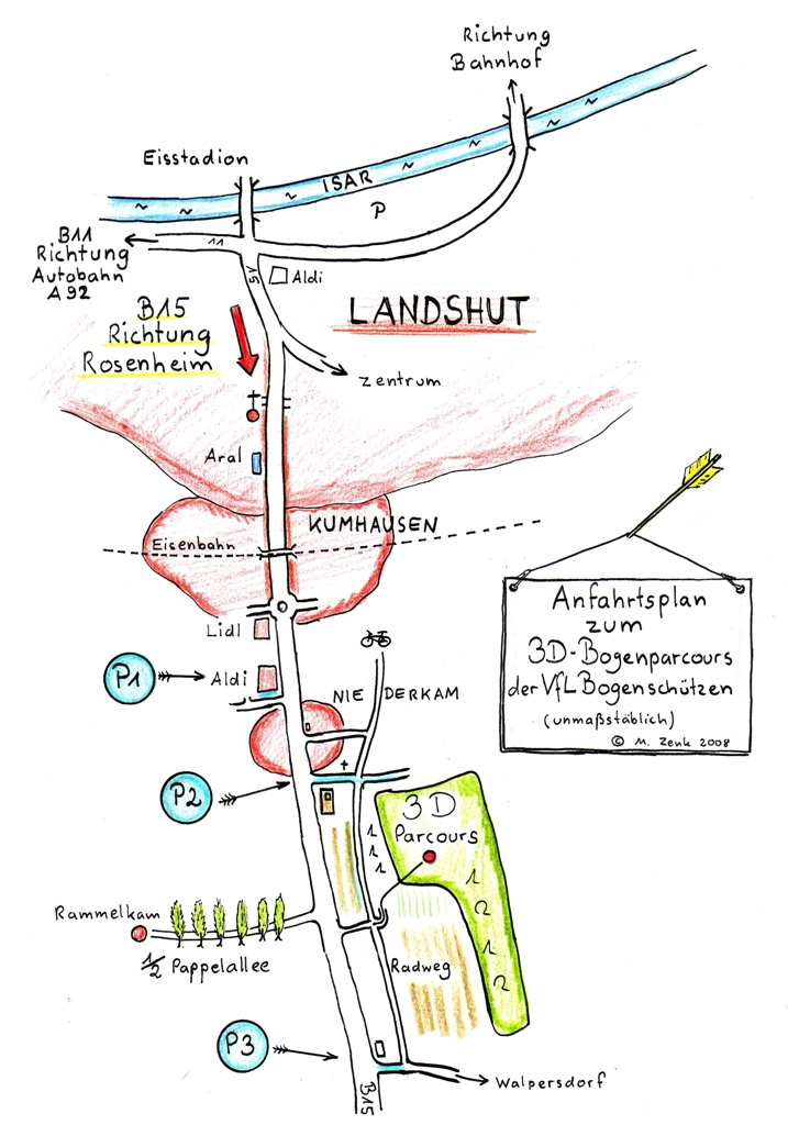 Parcoursgelände VFL LandshutÖffnungszeiten: ganzjährig (Achtung: Vom 15.11.2009 bis 15.01.2010 ist der Parcours geschlossen) Gebühren für Gäste: Erwachsene 6,- Euro; Jugendliche bis 16 Jahren 4,- Euro Es sind alle Bogentypen zugelassen - einschliesslich Compound Homepage: www.vfl-landshut.de "Parcours der kurzen Wege" Diese kurzen knappen Worte beschreiben perfekt diesen Parcours. Ein kompaktes Bündel an 3D-Tieren und Scheiben in einem kleinen Waldstück. Nicht weite Wegstrecken und beschwerliche Klettertouren machen den Reiz dieses schönen kleinen Fleckchens aus, sondern die schnell aufeinanderfolgenden Ziele.. In dieser Kürze liegt hier die bekannte Würze. Die Anfahrt zum Gelände ist einfach zu finden. Man folgt von der Autobahn Landshut-München kommend einfach schnurstracks der B15 Richtung Niederkam. Ein kleines Stück Fussweg benötigt man noch zum Parcours der durch einen kleinen Bauwagen auf sich aufmerksam macht. Kassenhäuschen, Möglichkeit zum Bogenspannen und Einschiessanlage finden sich natürlich gleich am Zugang.