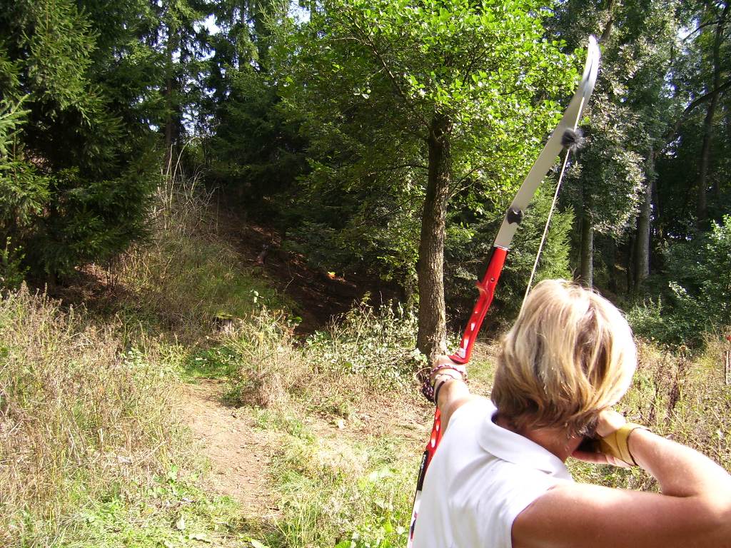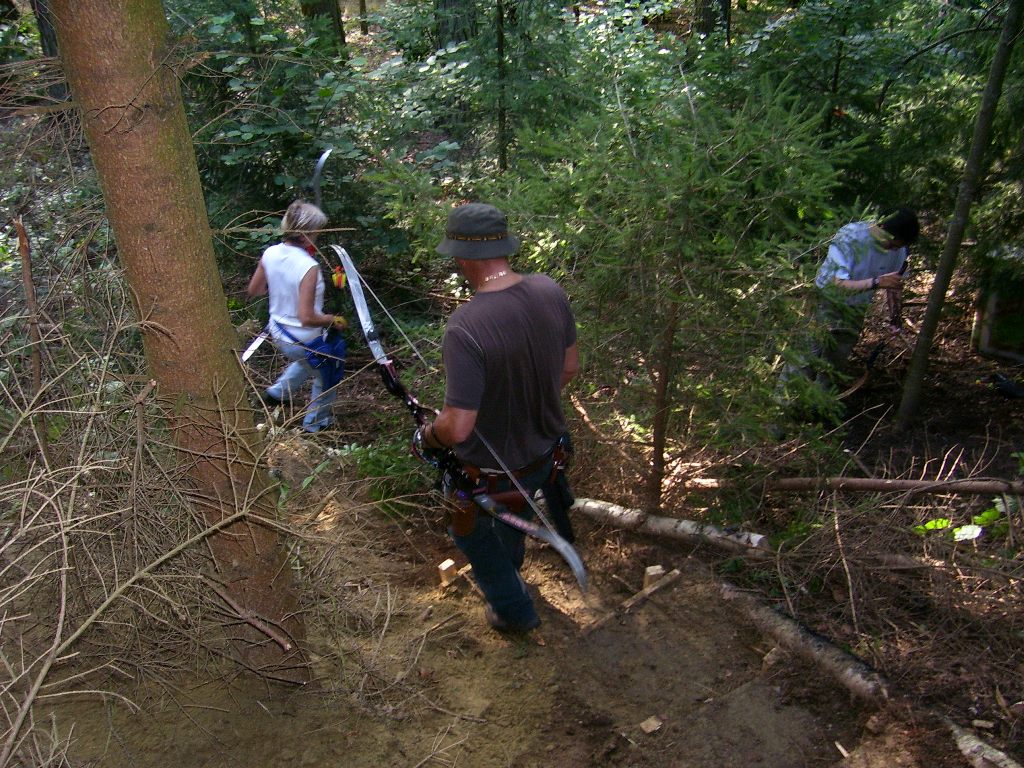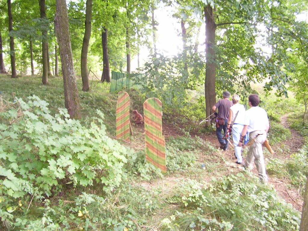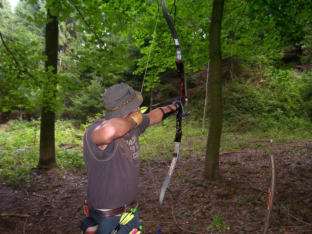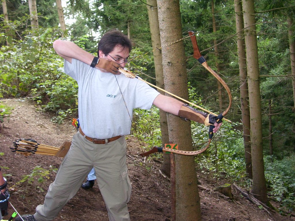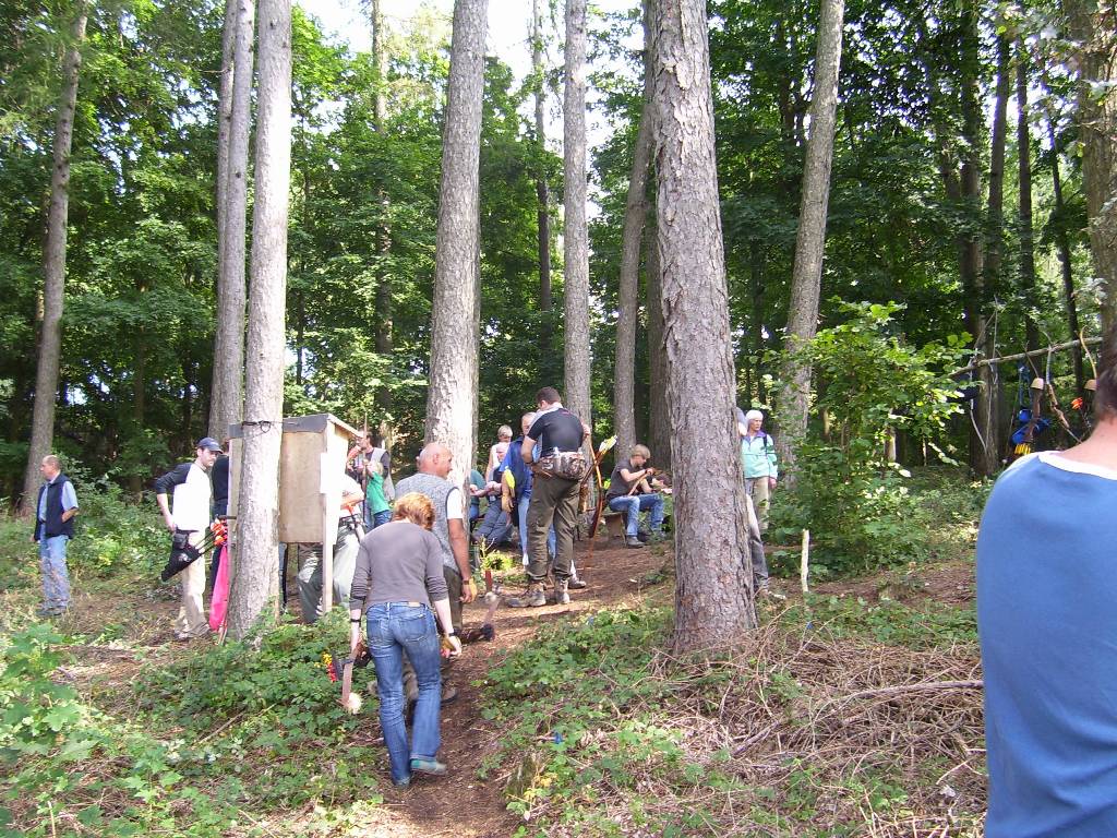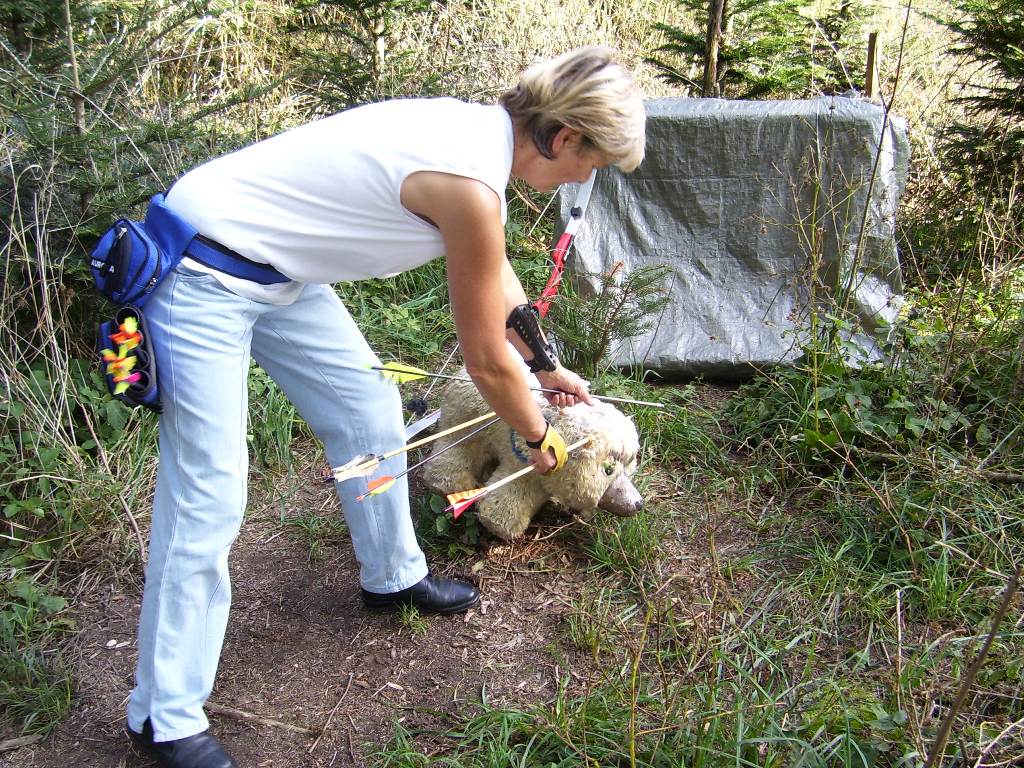 Erstes 3D Turnier in Niederkam des VfL Landshut-Achdorf 1920 e.V.Am 20.09.2009 veranstaltete der VfL Landshut sein erstes 3D-Turnier. In dem von uns gern besuchten Parcours bei Niederkam versammelten sich über 50 Teilnehmer. Zugegeben - wir waren etwas skeptisch ob sich diese Teilnehmerschar auch in dem kleinen Parcours ohne Stauungen verteilen würde, aber wir wurden schnell eines besseren belehrt. Treffpunkt zur Anmeldung war das Vereinsheim des VfL Landshut von wo aus wir zum Parcours weiterfuhren. Die Gruppen waren klein genug gehalten so dass sich niemand ins Gehege kam und zumindest bei unserer Gruppe keinerlei Stauungen oder Wartezeiten zu bemerken waren. Dass alle Ziele so gestellt waren, dass auch ein fehlgegangener Pfeil schnell wieder gefunden werden konnte tat mit Sicherheit sein Übriges dazu. Überhaupt wurden hier Pfeilfangteppiche aber auch die natürliche Gegebenheiten als Pfeilfang bestens ausgenutzt. Da sich zum großen Teil durch den Parcours ein kleiner aber steiler Hang zieht (Auf- und Abstieg übrigens sehr schön gelöst mit behelfsmässigen Stufen am Hang, so daß auch hier Sicherheit gegeben ist), waren einige schöne Bergauf- und vor allem fordernde Bergabschüsse möglich. Diese wurden zum Teil inzwischen auch deutlich weiter gestellt, so dass sich die Herausforderung doch merklich erhöht hat. Überhaupt muss herausgestellt werden, daß man doch bemerkenswert viele Weitschüsse in den "Parcours der kurzen Wege" gepack hat, die natürlich mit zum Interessantesten gehörten. Richtig bewegliche Ziele (wie ein laufender Keiler o.ä., die ja unsere Favoriten sind) gab es zwar leider nicht, aber ein ähnliches Feeling konnte sich schon durch die an Seilen aufgehängten 3D-Vögel einstellen, die natürlich durch jeden Treffer oder Streifschuss in Schwingung versetzt wurden. Wie so üblich gehörte auch zu diesem Turnier natürlich ein Glücksschuß. Es galt auf eine Scheibe mit verdeckt angebrachten Spielkarten zu schiessen. Der Treffer des Herz-Asses konnte anschliessend die für den Glücksschuss ausgegebenen Beträge (pro Preil 1,- EUR) als Jackpott gewinnen. Zurück im Vereinsheim gab es für jeden Teilnehmer eine Urkunde mit Platzierung und Punktzahl - die Bestplazierten konnten natürlich wieder Sachpreise entgegennehmen. Einziger Wermutstropfen für Armin und mich war, dass wir die beiden einzigen waren, die mit Reiterbögen angerückt sind und sich damit natürlich auch keine eigene Wertungsklasse öffnen lies. Da hoffen wir mal auf rege Reiter- und/oder Primitivbogenteilnahme an den nächsten Turnieren und natürlich, dass der VfL Landshut wieder so ein Turnier veranstaltet, denn daß sie einen unterhaltsamen Nachmittag gestalten können haben sie hier deutlich unter Beweis gestellt. Tom